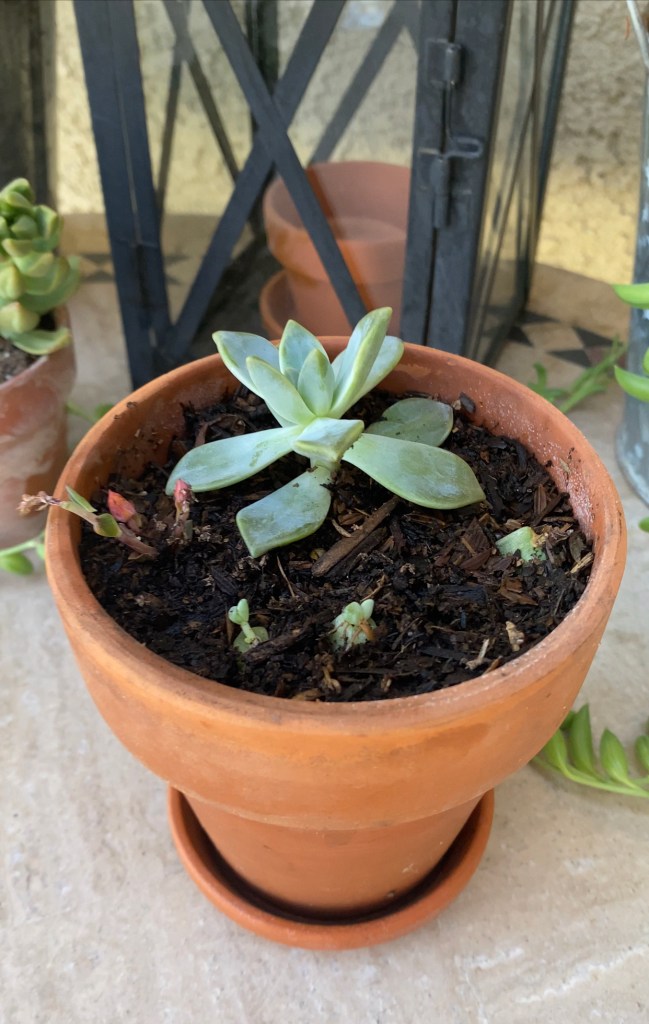 I officially have three baby succulents growing and thriving in their new potted home. I also have the two top clippings happily repotted, as well as the base I clipped from growing a new stalk. Over all I had about twenty leaves to propagate and only three survived – but it was a great learning experience and I really enjoyed trying something new.