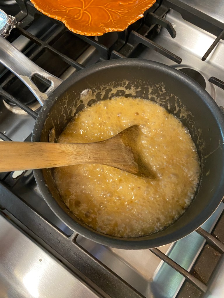 3. Once butter is melted, add the granulated sugar, brown sugar, heavy whipping cream and salt, mixing well