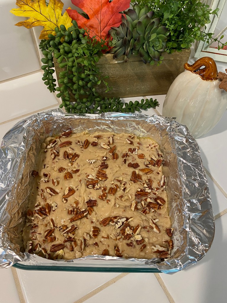 9. Add the remaining 1/2 cup of toasted pecans to the top of the fudge and gently press them in