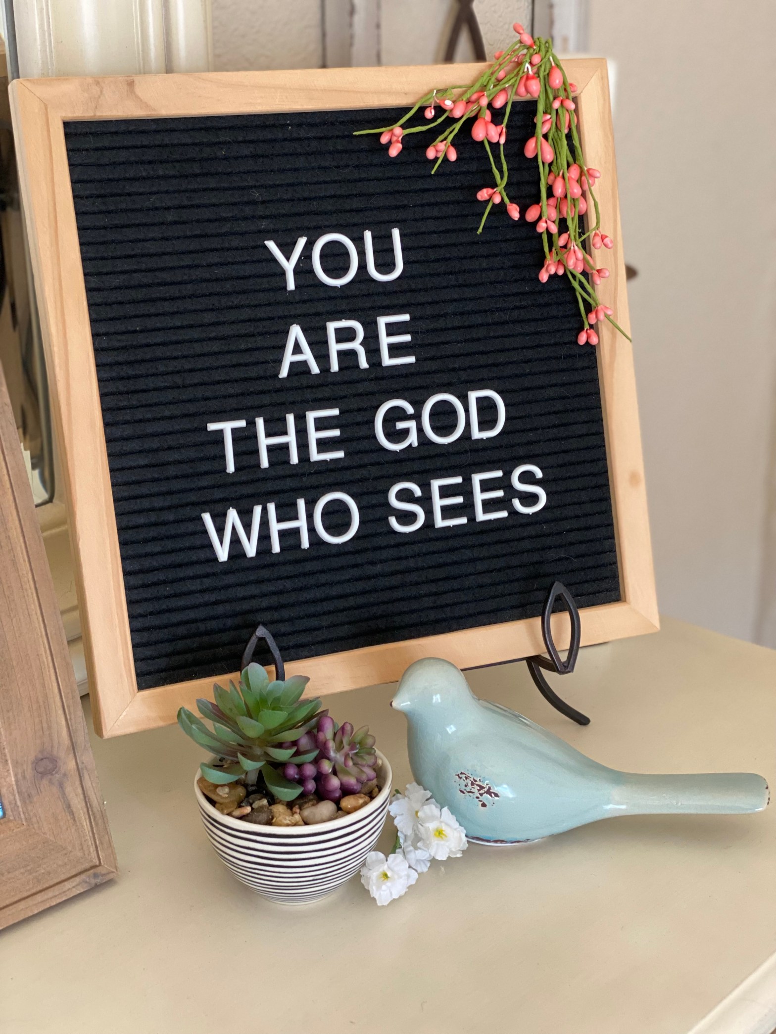 I loved what He said to me so much that I added it to my letter board displayed on my bedroom dresser. Now, every time I look at it I will be reminded. God sees. He sees me. I am not alone.
