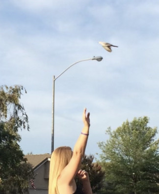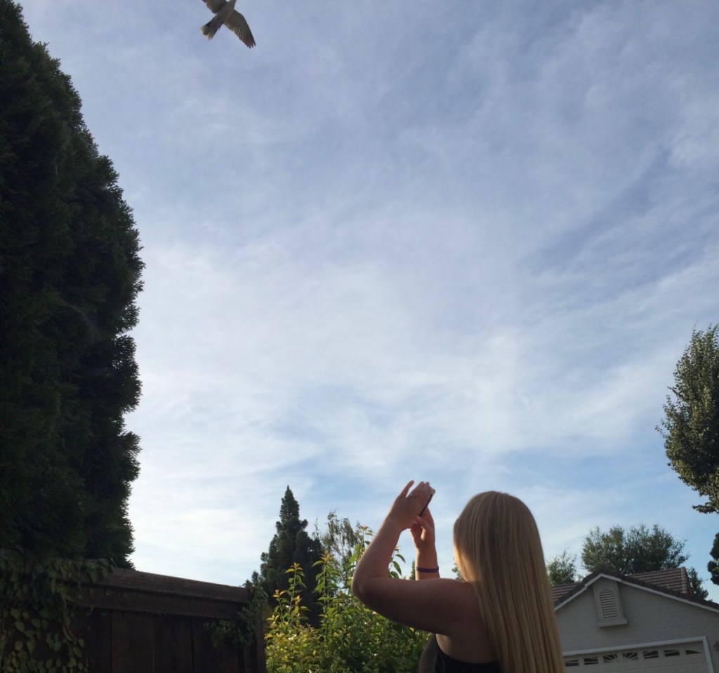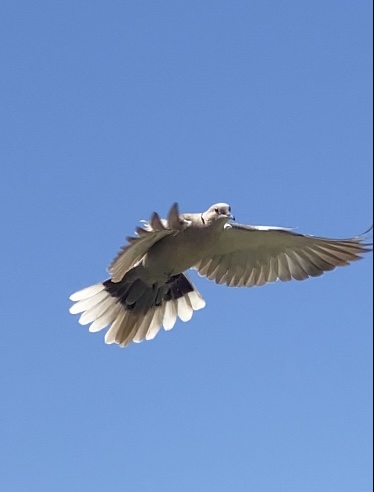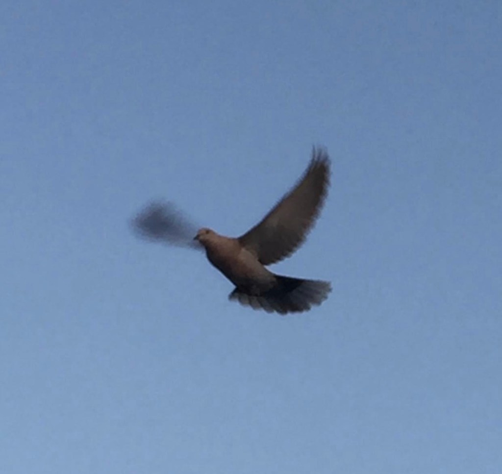 One of the most meaningful and incredible dove experiences I have ever encountered took place on June 30th, 2015. My husband Larry and I had just come home from getting ice cream at our local Fosters Freeze. It was something like 108 degrees that evening. When we arrived home about seven o’clock in the evening, we were getting out of our vehicle when I spotted a turtle dove on the light post in front of our house. It was cooing. Very loudly. I decided to try to imitate it’s dove coo by cupping my hands together and whistling in a way that my uncle had taught me to do as a little girl. Surprisingly it sounded so much like a dove coo. And this beautiful dove, perched upon the light post, remarkably responded. She flew over me, back and forth, over and over again for close to an hour. I would stretch my hand out and she would caw and coo and fly right above me repeatedly. She was so close I could almost touch her. It was incredible. I was astonished.