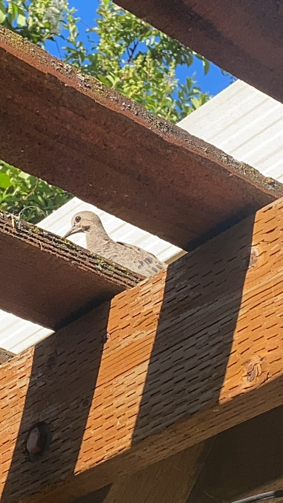 One last dove story I would like to share happened just last week. It was the morning of June 24th, 2022 and Larry and I were sitting out in the backyard. All of a sudden I noticed a baby dove (it was very small) sitting on top of our pergola right above us. This particular dove was a mourning dove, not a turtle dove (both types live in our neighborhood). I never heard this baby dove fly in and land. He just seemed to be there. Still and silent. Looking at me just as intently as I was looking at him.