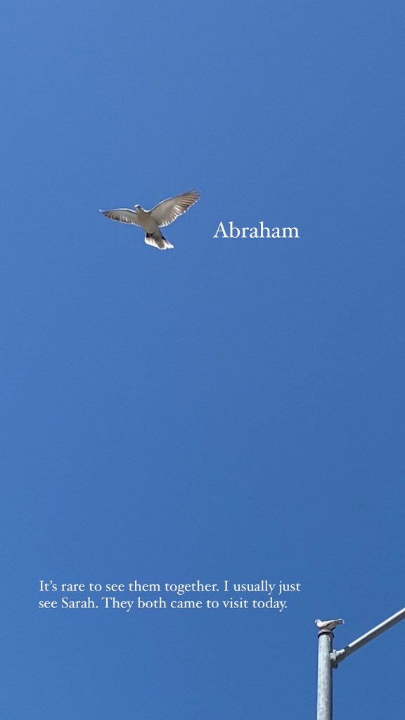 She stayed in the neighborhood, and a few weeks later, she brought her mate to meet me. I’ll never forget that moment. It was like she was introducing me to him, and him to me. I fell in love with these two doves and felt that the Lord sent them specifically for me to enjoy. I named them Sarah and Abraham. I chose those names because I thought it was fitting as they were called to wait on a promise just like me.