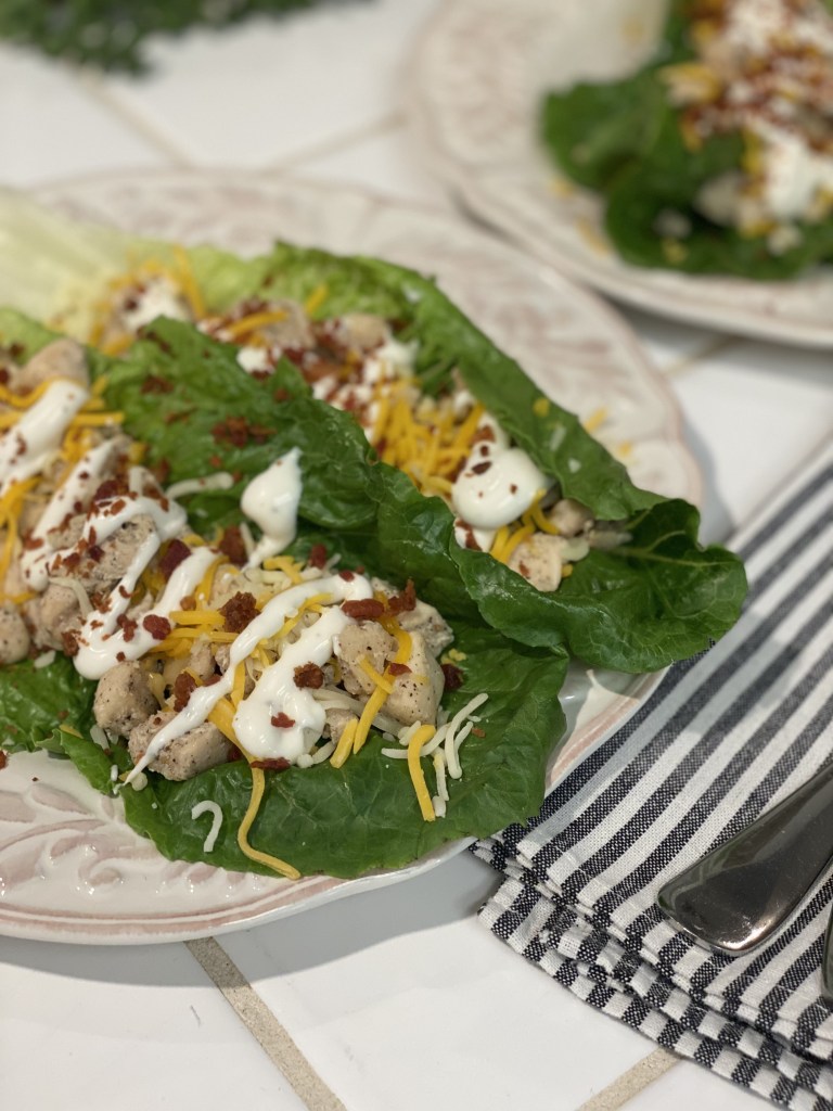 Place the cooked chicken in the Romain leaf and top with ranch, bacon and all the toppings you love.