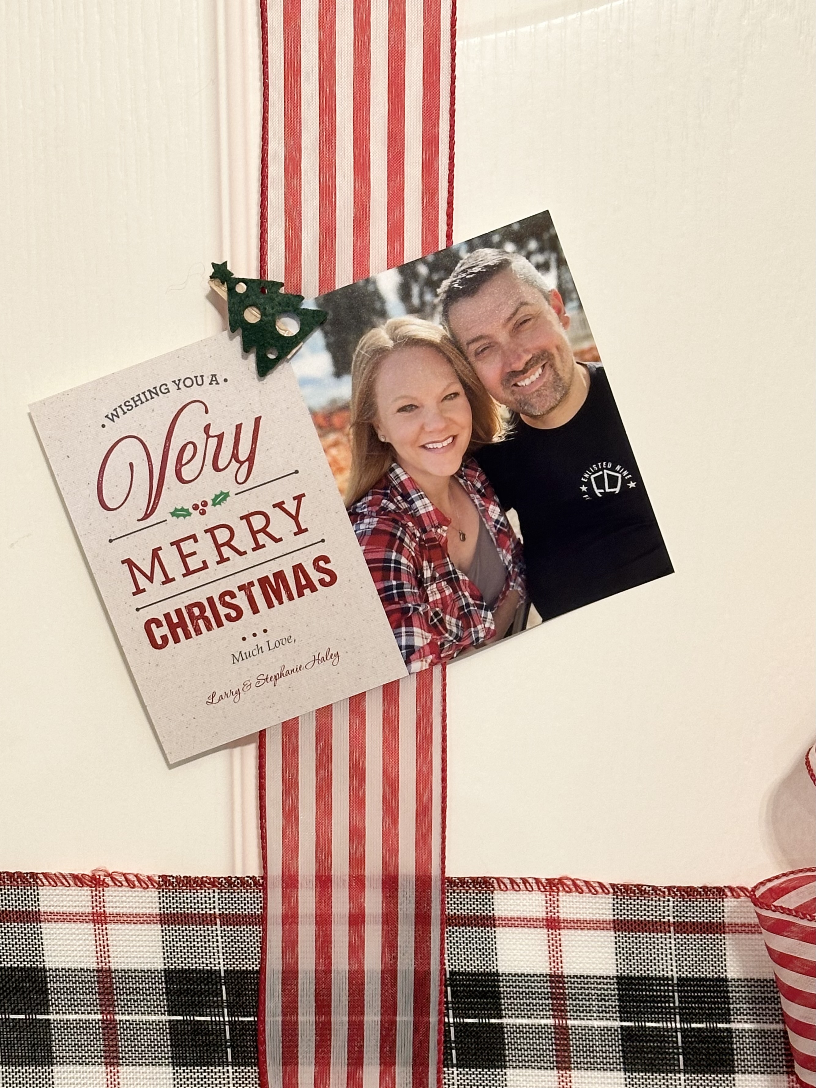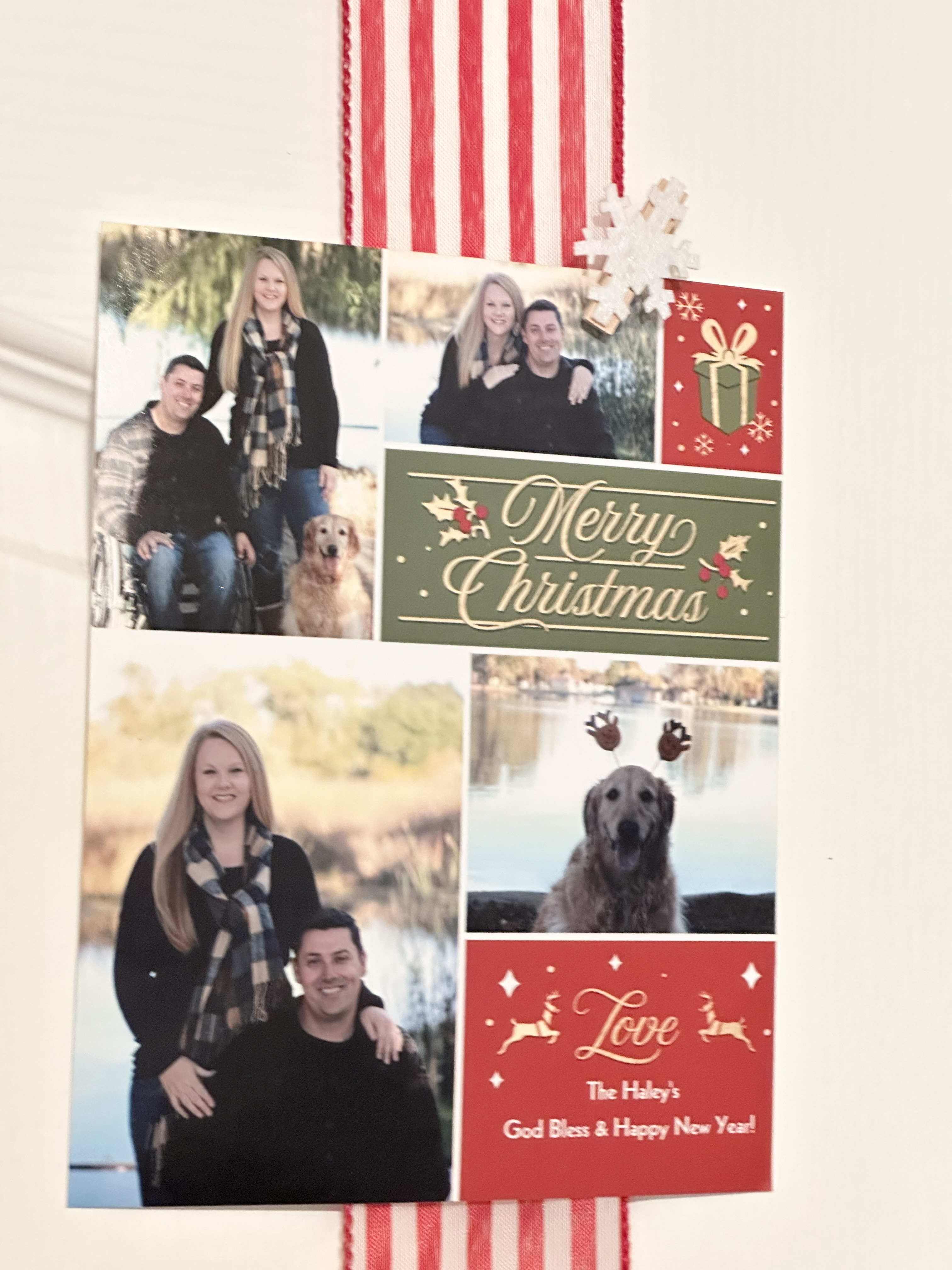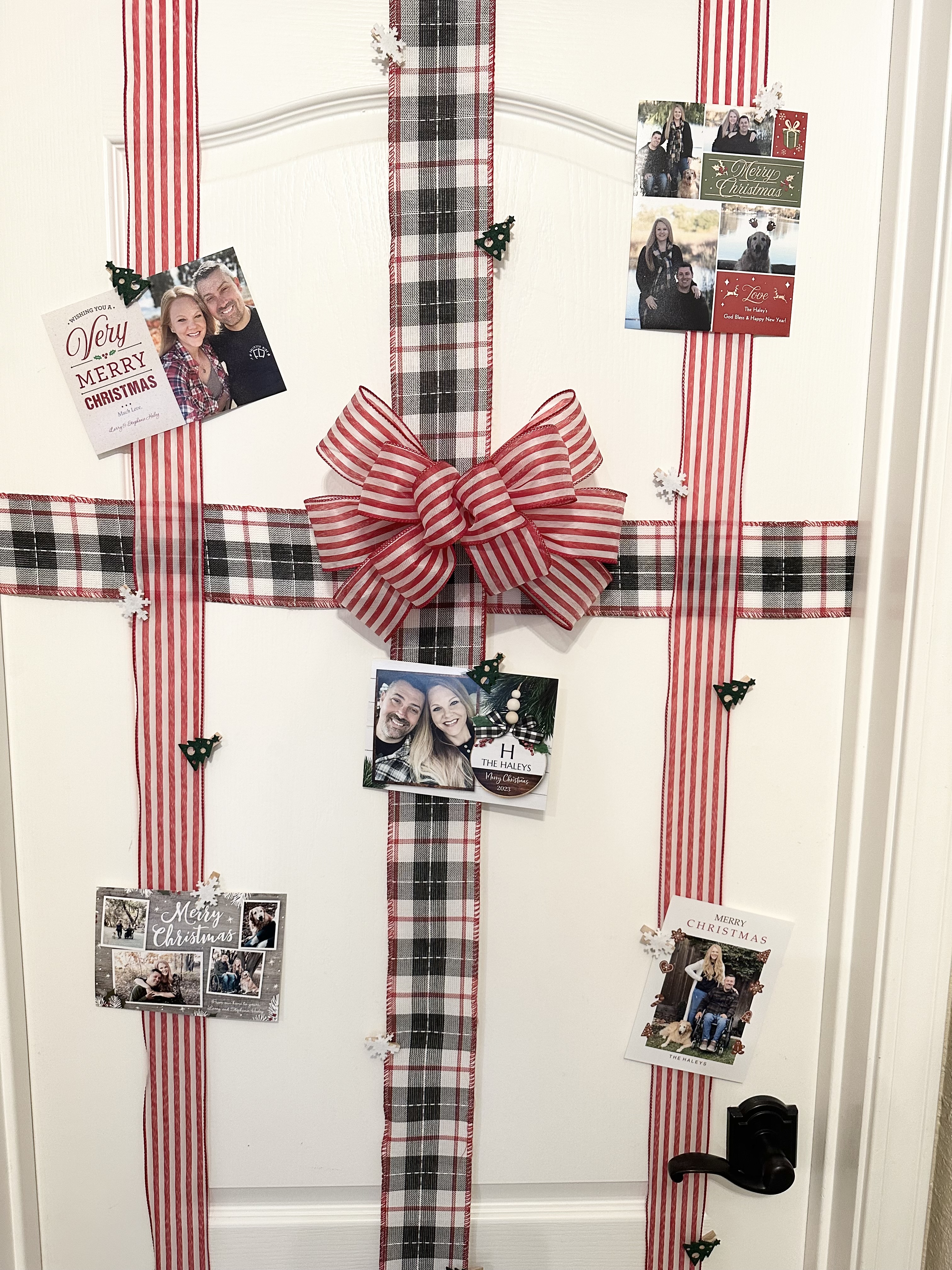 When my husband and I were first married we were only receiving a few cards per year. Back then I was displaying them on a big mirror by using double-sided tape. However over the years we have grown to accumulate quite a few cards by Christmas Day. Now I display them on a door by our entryway so they can be viewed by us daily as well as all of our guests.
