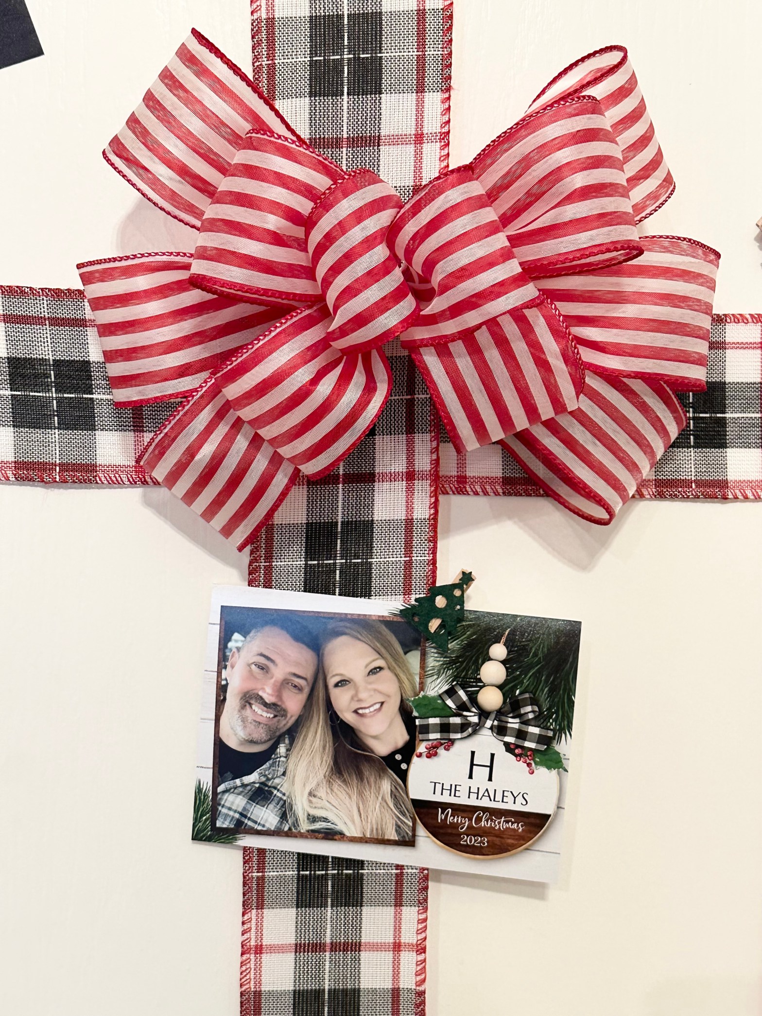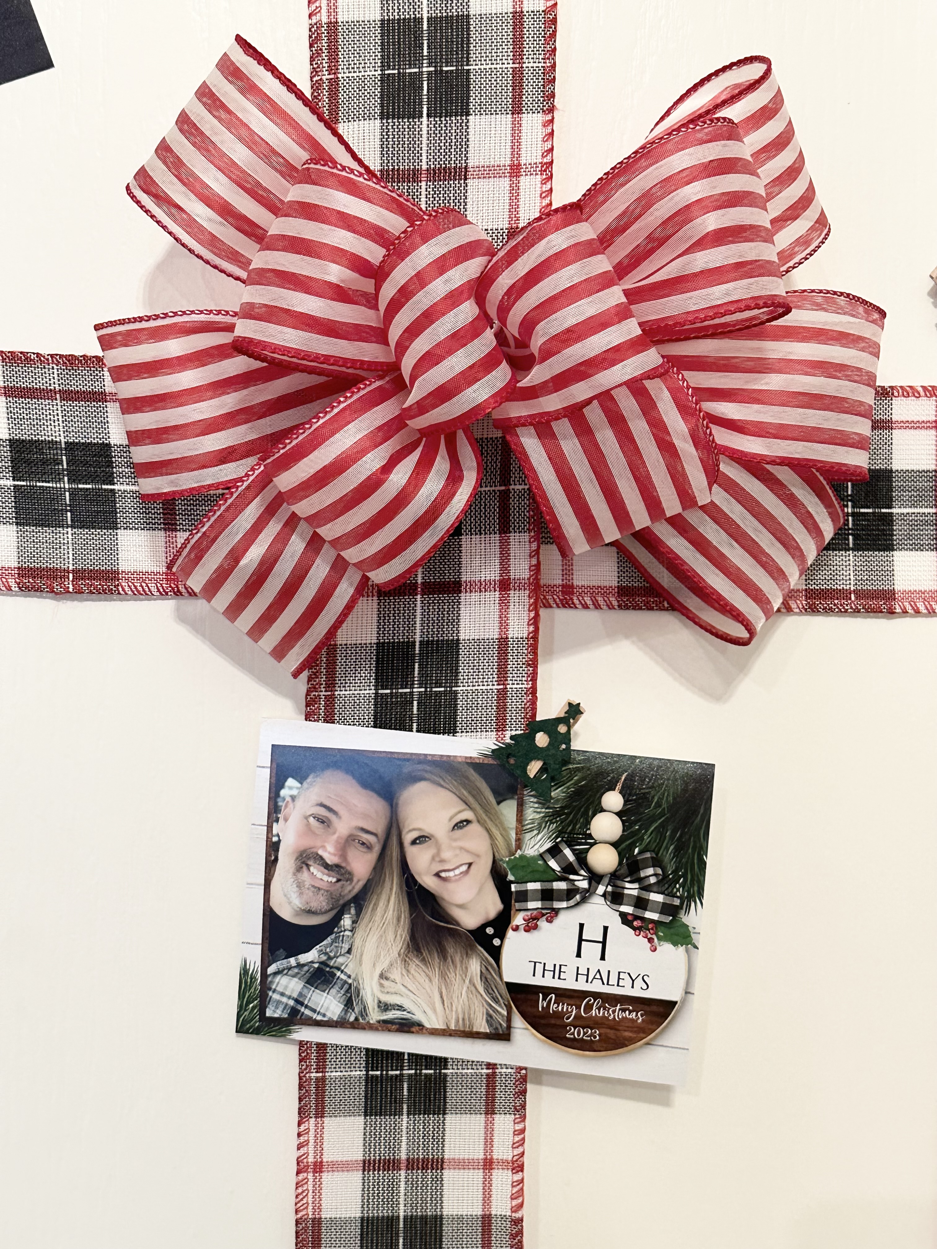 - Then I like to add a big bow in the front to make the door appear to be a giant Christmas present (thank you to my friend Kristy for showing me how to make the bow this year).