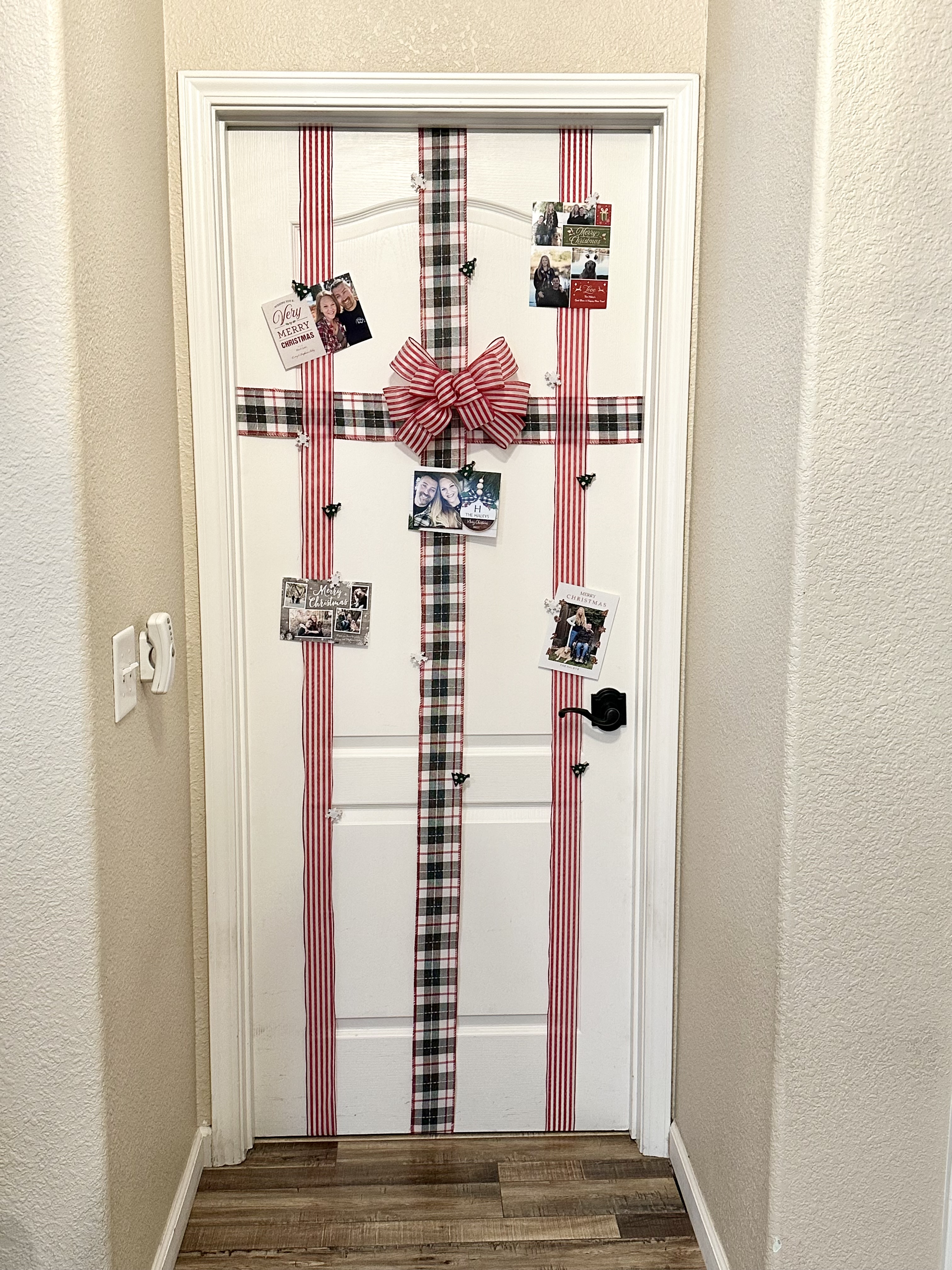 - Wrap the ribbon completely around the door and tie it in a small bow on the backside of the door. You can do one strip of ribbon vertically and one strip horizontally.