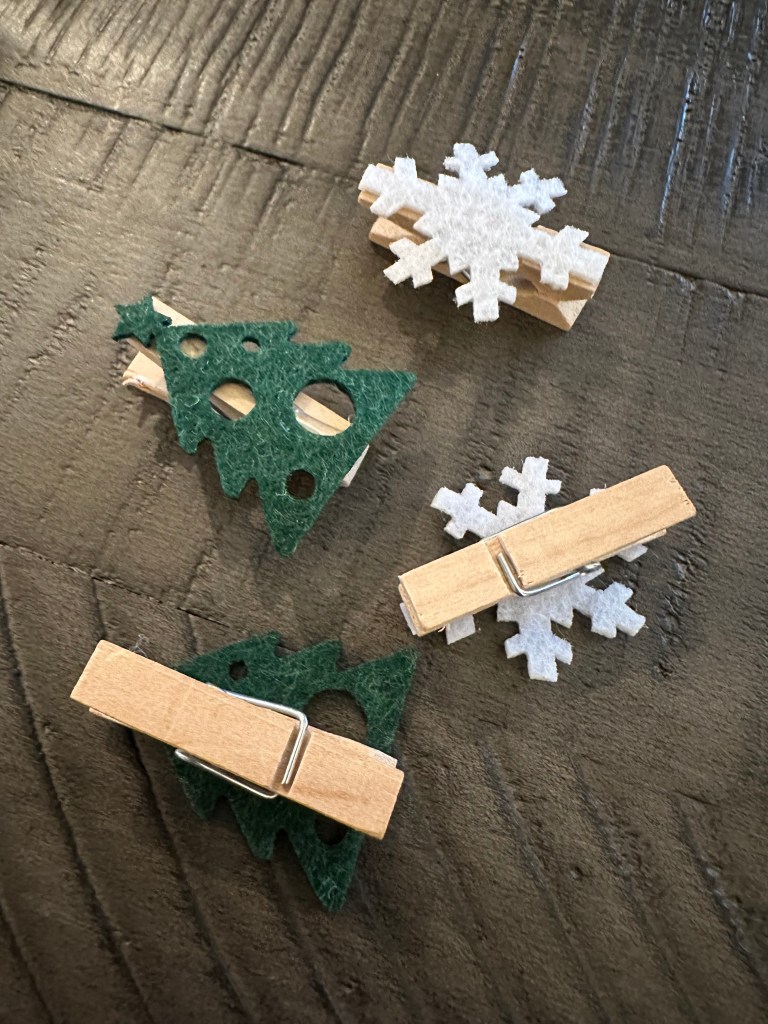 A few years ago, I found miniature clothes pins already decorated with felt Christmas trees and snowflakes at the dollar store. They work prefect for clipping the cards to the ribbon – and look adorable, too!